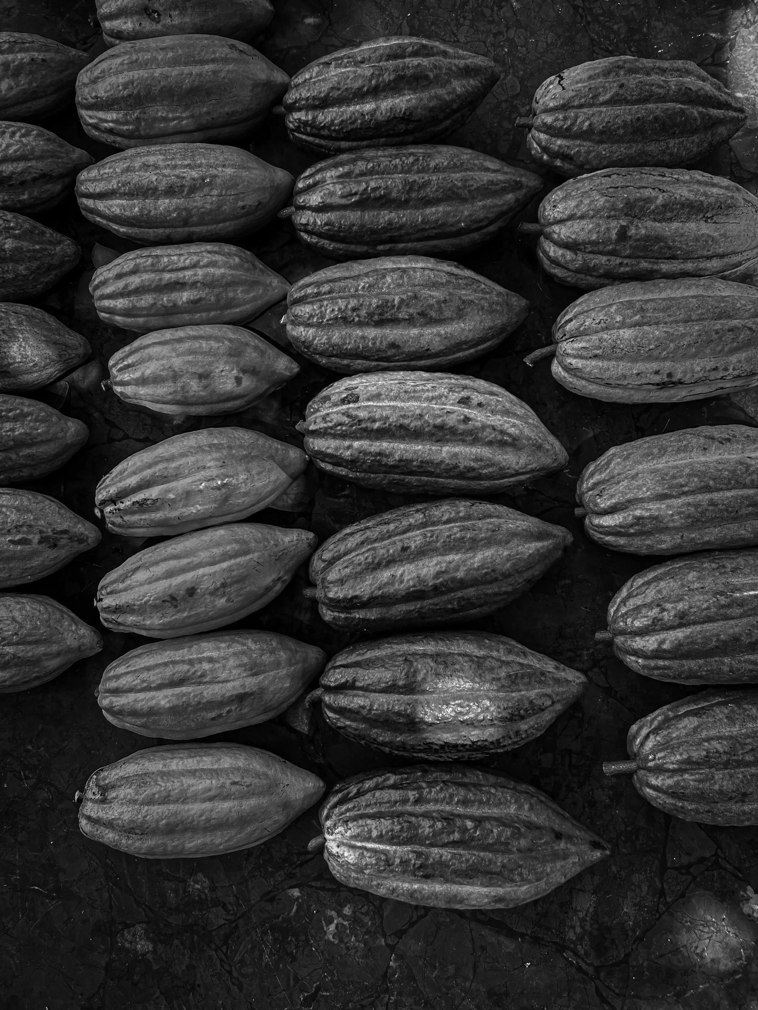 The colourful ripe pods are harvested from the Theobroma cocoa trees and cut open manually to remove the beans. Each pod contains only around 20-60 beans. On average, 40 cacao beans are required to make a 70% dark chocolate bar.
